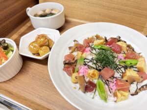 キハダマグロに黒糖を使って甘く仕上げた卵、歯応えの楽しめるスナップエンドウなど彩り豊かにお作りしました。
