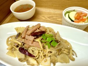 こちらはみんな大好き明宝ハムと、寒くなり旬になった秋野菜を使ったペペロンチーノです。